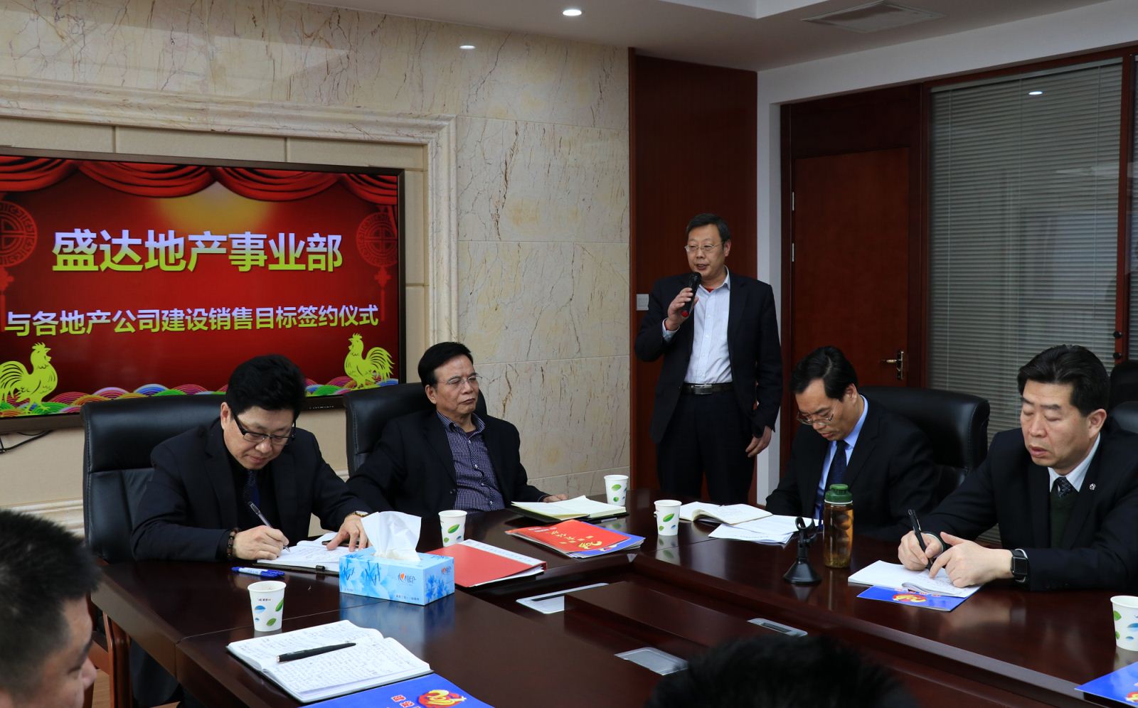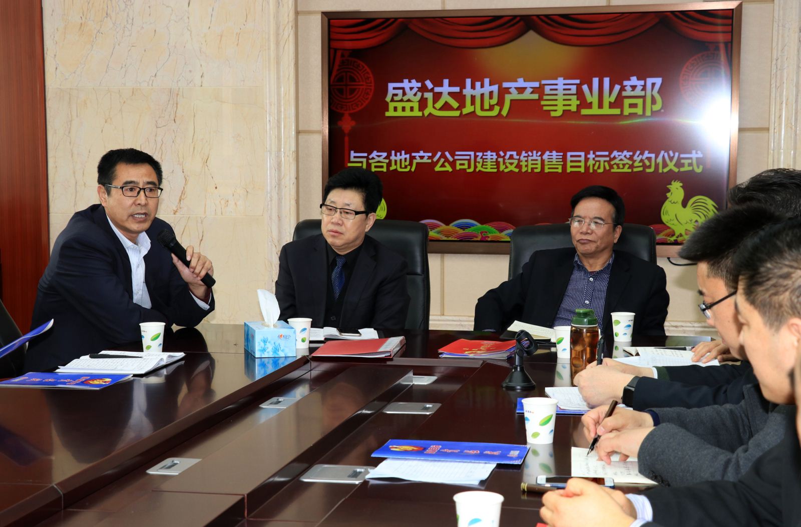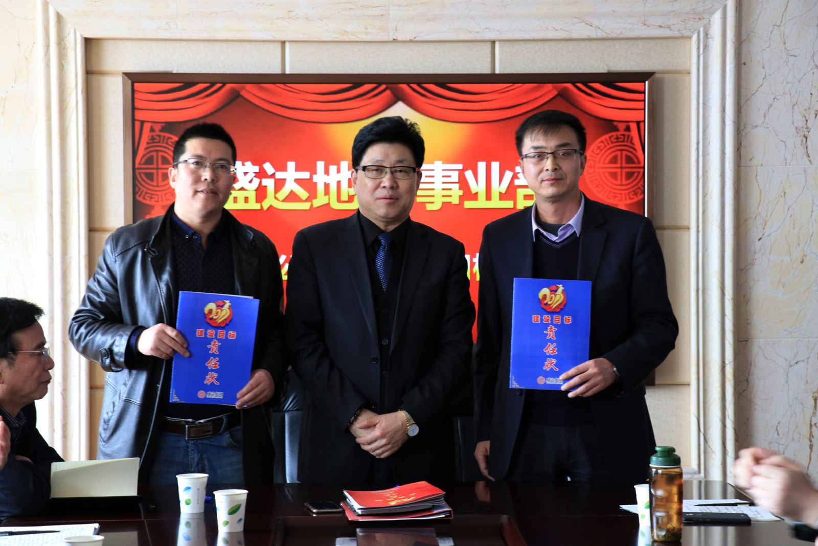 盛達(dá)集團(tuán)副總裁、地產(chǎn)事業(yè)部總經(jīng)理劉大利主持目標(biāo)責(zé)任狀簽訂會(huì)。出席簽訂會(huì)的地產(chǎn)事業(yè)部領(lǐng)導(dǎo)有崔照新、張志權(quán)、梁貴倉(cāng)。 盛達(dá)集團(tuán)監(jiān)事會(huì)副主席馬海順也出席簽訂會(huì)。
